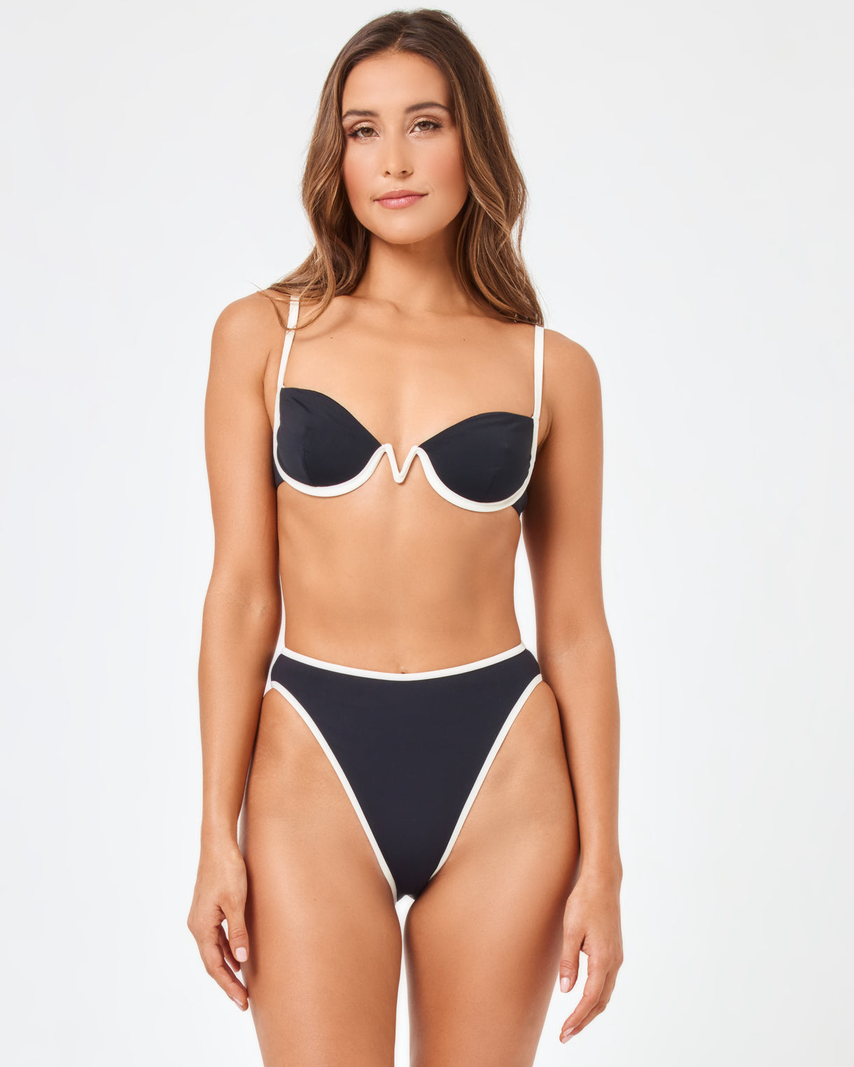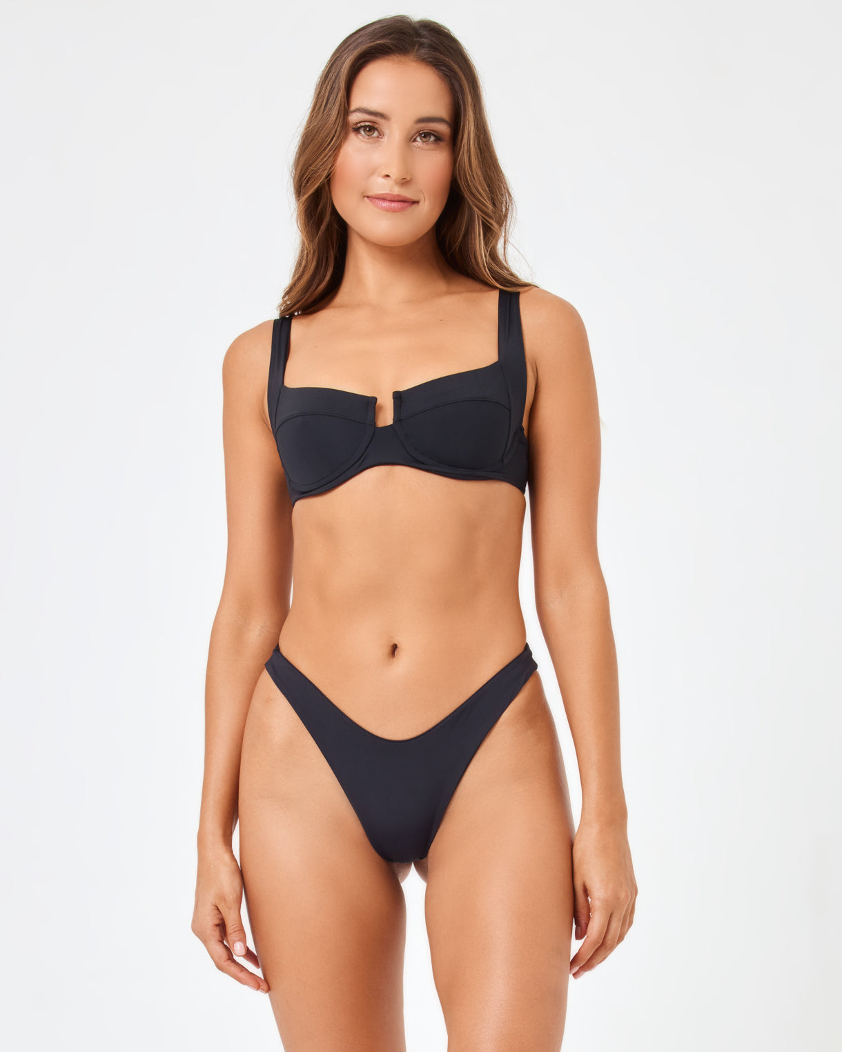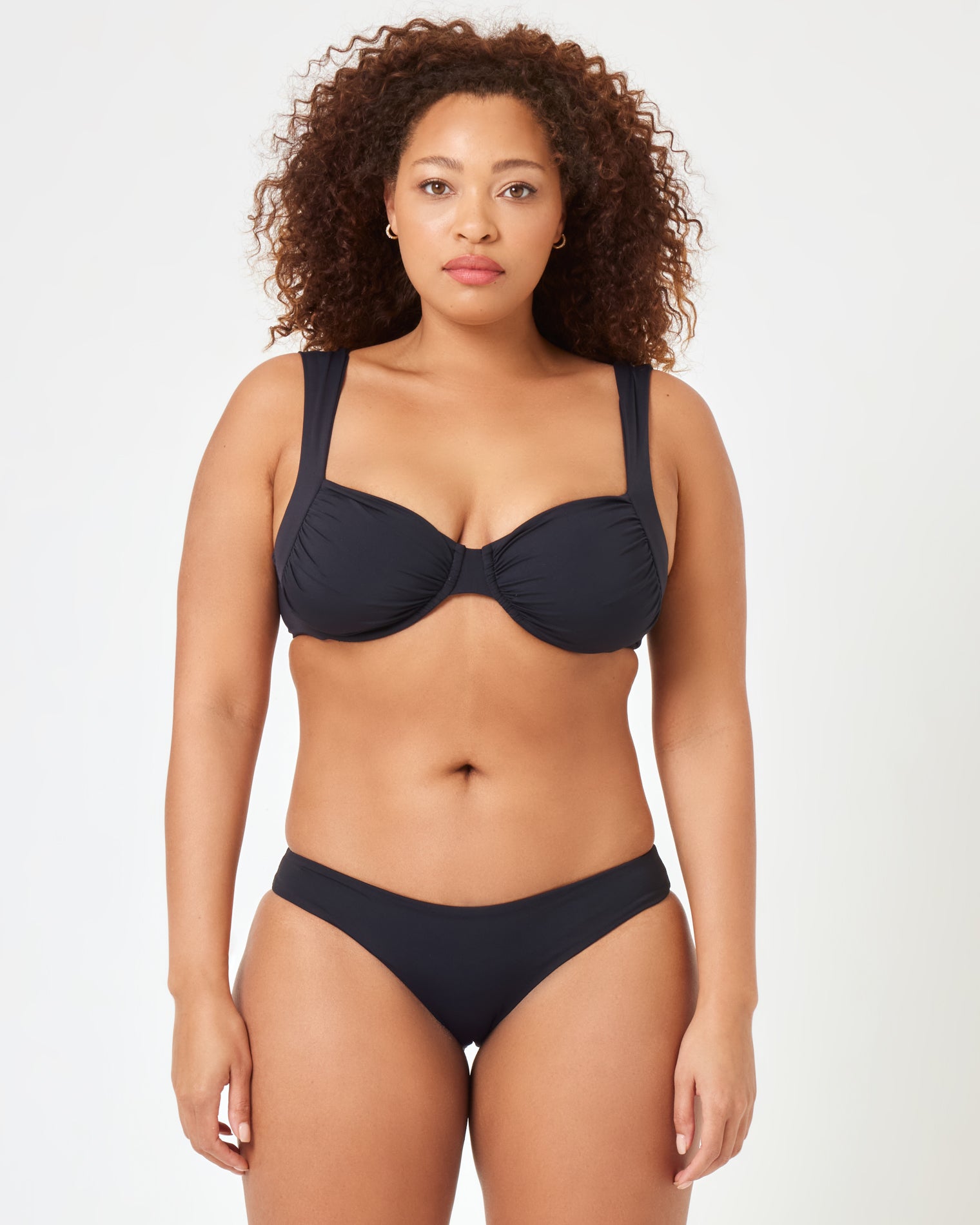 An underwire demi cup combines with a center-front "v" feature to showcase your best assets. This cute new bikini top is now here in three moody hues.