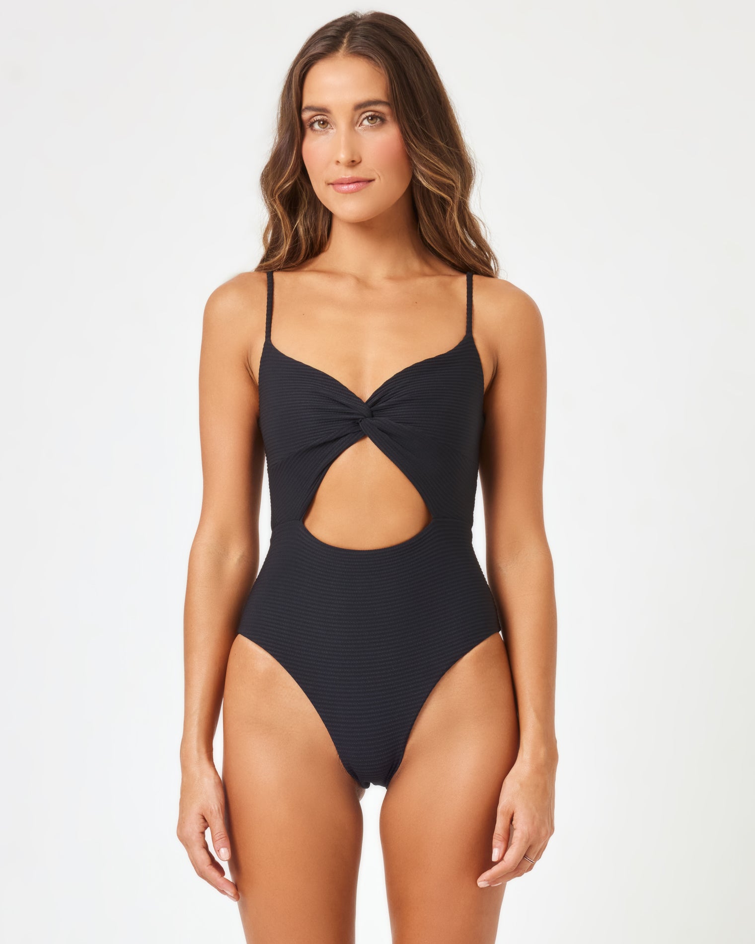 Earth-friendly never looked better than the Kyslee one piece. No detail was left out in the creation of this beauty with its twist front keyhole in the center, adjustable straps + back.